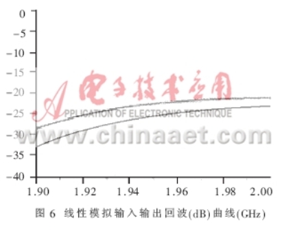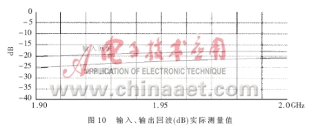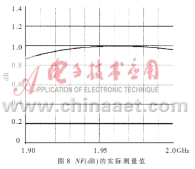 得到了完整的電路PCB板后,就要實(shí)際測(cè)量電路的各個(gè)參數(shù),驗(yàn)證設(shè)計(jì)的仿真結(jié)果是否與之相符,是否最終符合表1的設(shè)計(jì)技術(shù)規(guī)范。本文所采用的測(cè)試儀器是HP8753ES網(wǎng)絡(luò)分析儀和HP8970B噪聲儀。圖8、圖9表達(dá)出放大器實(shí)測(cè)的NF和增益曲線,在帶寬為0.1GHz的頻率范圍內(nèi)NF的值在0.8dB和1.0dB之間,增益在1.97GHz達(dá)到最大值15.5dB,在1.99GHz達(dá)到了15.3dB。由于NF是在實(shí)際PCB板外腔體內(nèi)測(cè)得的,包含了同軸連接器的損耗和二級(jí)噪聲損耗,其測(cè)量指標(biāo)表明實(shí)際的電路NF特性要稍差于模擬特性。圖10是輸入、輸出的回波曲線。當(dāng)頻點(diǎn)在1.96GHz時(shí),輸入回波為18dB,輸出回波達(dá)到22.5dB,放大器的OIP3在直流偏置Vds=3V,Id=60mA時(shí)測(cè)得值為37dBm,P1dB為21.4dBm。電路在較低的偏置狀態(tài)下Vds=3V,Id=40mA放大器的NF和增益都沒有降低,只有OIP3測(cè)出下降為36.5dBm。