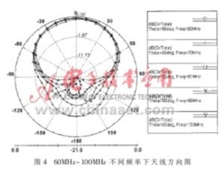 圖3為f=70MHz時(shí)天線的二維方向圖,從中可以看出,天線方向性系數(shù)達(dá)到7dB左右,而利用文獻(xiàn)中的圖表所查到方向性系數(shù)為6.5dB。圖4給出了幾個(gè)頻率下天線的二維方向圖,可以看出,各個(gè)頻率下方向圖形狀大致相同,但隨著頻率越靠近頻率范圍的上下限、方向圖背瓣越大。