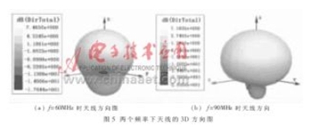 為了更形象地描述天線的方向性,軟件可以給出三維方向圖。頻率為60MHz和90MHz時(shí)天線的三維方向圖如圖5所示。表1給出天線的方向性系數(shù) 。