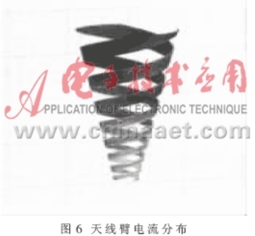 圖6表示頻率f=80MHz時(shí)電流在天線臂上的分布,可以看出傳導(dǎo)電流從天線饋電點(diǎn)(即圓錐頂部一端)流入,先經(jīng)過傳輸區(qū)(約下面的2圈),再向上是輻射區(qū)(約第3圈),最后為衰減區(qū)(后面幾圈)。在傳輸區(qū)內(nèi),電流大小變化不明顯,到達(dá)輻射區(qū)后,隨著大量能量以電磁波的形式傳播,電流迅速減小,最后經(jīng)過衰減區(qū),電流逐漸減小至零,這符合天線一般規(guī)律。其中,輻射區(qū)的位置與頻率有關(guān),即位于波長近似于圓錐截面周長的地方。可以想象,不同頻率會對應(yīng)不同的輻射區(qū)位置,這是CLS天線的工作特性,也是CLS天線具有寬帶特性的原因。