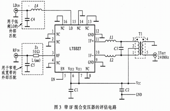 圖3示出由混合變壓器構成的lF匹配電路,以達到最低LO-IF泄漏和最寬的IF帶寬。圖4示出由1個離散的IF不平衡變壓器代替IF變壓器的電路,以降低成本和縮小尺寸,盡管離散的IF不平衡變壓器也有較理想的噪聲系數、線性度及較高的轉換增益,但是LO-IF泄漏降低,IF的帶寬減小。