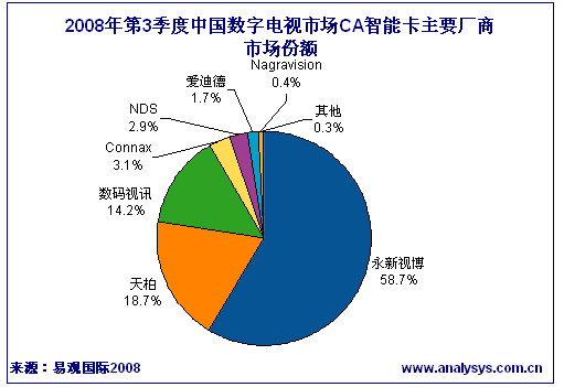 永新視博以58.7%的過(guò)半市場(chǎng)份額保持絕對(duì)領(lǐng)先,較上季度市場(chǎng)份額上升了15個(gè)百分點(diǎn),而天柏和數(shù)碼視訊分別發(fā)卡67萬(wàn)和51萬(wàn),都比上期有不少程度的下降。