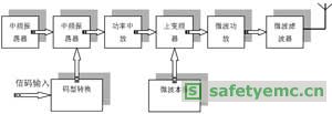 中頻調(diào)制發(fā)射機(jī)的方框圖如圖2所示。信碼經(jīng)過(guò)碼型變換后,在中頻調(diào)制器中進(jìn)行調(diào)制,獲得中頻調(diào)制信號(hào),然后經(jīng)過(guò)功率中放,把這個(gè)己調(diào)信號(hào)放大到上變頻器要求的功率電平。上變頻器把它變換為微波調(diào)制信號(hào),再經(jīng)微波功率放大器放大到所需的輸出功率電平,最后經(jīng)微波濾波器輸出饋送到天線(xiàn),由發(fā)射天線(xiàn)將信號(hào)送出。