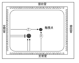 當(dāng)有觸摸時(shí),手指或其它物就會(huì)擋住經(jīng)過該位置的橫豎紅外線,觸摸屏掃描時(shí)發(fā)現(xiàn)并確信有一條紅外線受阻后,紅燈亮,表示有紅外線受阻,可能有觸摸,同時(shí)立刻換到另一坐標(biāo)再掃描,如果再發(fā)現(xiàn)另外一軸也有一條紅外線受阻,黃燈亮,表示發(fā)現(xiàn)觸摸,并將兩個(gè)發(fā)現(xiàn)阻隔的紅外對管位置報(bào)告給主機(jī),經(jīng)過計(jì)算判斷出觸摸點(diǎn)在屏幕的位置。