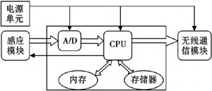 無線傳感器體系結(jié)構(gòu)含有電源單元、感應(yīng)模塊、無線通信模塊、微控制器。硬件設(shè)計(jì)結(jié)構(gòu)如圖1所示。