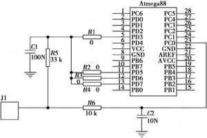 對微控制器芯片選擇Atmel ATmega88,因?yàn)樗哂械凸模€有待機(jī)模式和主動模式的快速轉(zhuǎn)換功能,所以無線傳感器能夠在非常短的時(shí)間完成數(shù)據(jù)的測量和傳輸;它有一個(gè)內(nèi)置的掉電檢測電路,可用來提醒用戶傳感器網(wǎng)絡(luò)電池是否需要更換;它還有一個(gè)內(nèi)置的A/D轉(zhuǎn)換器,可以將傳感器的模擬信號轉(zhuǎn)換成具有10位數(shù)字值的數(shù)字信號(零代表0V,210-1代表電源電壓和最大可能電壓)。