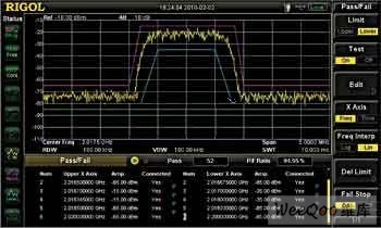 對于問題三可以利用DSA1030A頻譜分析儀中的Pass/Fail功能來解決。用戶根據(jù)實際的需求提前編輯好兩條標(biāo)準(zhǔn)跡線即測量的上限和下限,開啟該功能后會對測量結(jié)果進(jìn)行統(tǒng)計通過率。在測量失敗的時候會自動停止測量,查看測量失敗的頻率和幅度。如圖3所示,利用Pass/Fail功能監(jiān)控信號的大小。