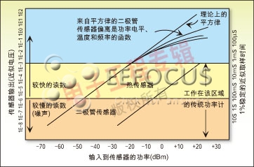 圖2所示為熱電堆單元和二極管檢測(cè)器的響應(yīng)。傳統(tǒng)的二極管檢測(cè)器要么工作在平方律區(qū)域,因此動(dòng)態(tài)范圍被限制為50dB;要么采用線性校正技術(shù)來擴(kuò)展它們的動(dòng)態(tài)范圍。這種技術(shù)受到功率計(jì)速度的限制,并且不適合于系統(tǒng)傳輸?shù)姆?hào)率遠(yuǎn)遠(yuǎn)超過功率計(jì)采樣率的應(yīng)用。