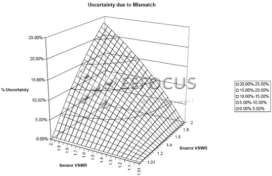這是傳感器和校正因子的校正系統(tǒng)之間不匹配的函數(shù),它受到被測(cè)傳感器的影響。所以,對(duì)于38GHz的快速熱傳感器的例子,其具有的校正因子不確定性為3.62%,而2.2 GHz的通用傳感器具有0.6%的校正因子不確定性。