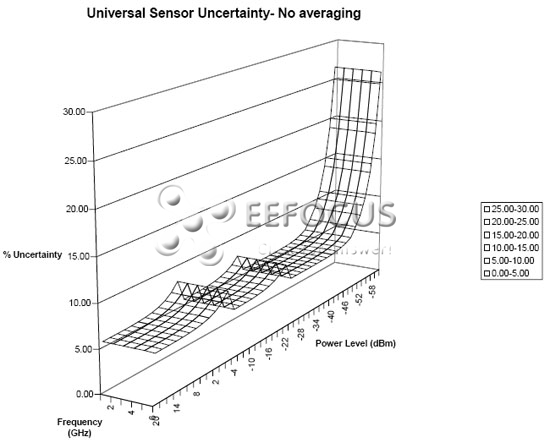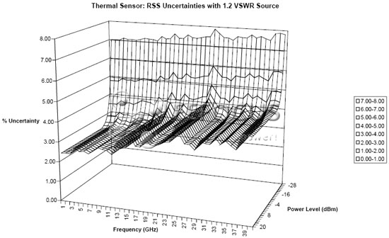 該圖顯示了熱電堆傳感器在其整個(gè)工作頻率范圍內(nèi)的不確定性表面。在該情形下,信號(hào)源匹配一直固定在1.2,所以由于不匹配引起的不確定性被減小了。不確定性已經(jīng)被當(dāng)作RSS項(xiàng)疊加。在低功率電平上不確定性的增加主要是由零位調(diào)整參數(shù)引起的。這種與頻率相關(guān)的紋波是因在整個(gè)范圍內(nèi)變化的校正因子的不確定性引起的。