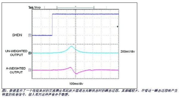 評(píng)估音頻性能的一個(gè)重要指標(biāo)是設(shè)備在打開或關(guān)斷時(shí),耳機(jī)(或揚(yáng)聲器)出現(xiàn)的“咔嗒”聲或其它奇怪的瞬態(tài)噪聲。隨著人們對(duì)產(chǎn)品性能期望值的提高,無瞬態(tài)雜音成為人們選擇產(chǎn)品的一項(xiàng)重要指標(biāo),因而也是便攜式音頻設(shè)備的關(guān)鍵賣點(diǎn)。直到目前為止,業(yè)界仍然從主觀上評(píng)價(jià)這種咔嗒聲,“較低的咔嗒聲”和“無咔嗒聲工作”等描述代表了對(duì)咔嗒聲定量分析的主觀判斷。但是,用戶的期望值在變化,設(shè)計(jì)人員需要得到評(píng)判咔嗒聲的客觀指標(biāo)。