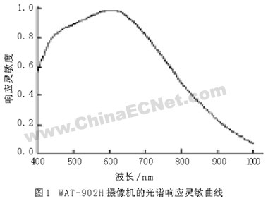 獲得的圖像質(zhì)量直接影響圖像處理程序的復(fù)雜度和檢測結(jié)果。如果采用的光源單色性越好,越接近平行光,則圖片的干涉條紋更清晰,質(zhì)量更好。然而單色激光器或者平行光源體積大,而紅外測試系統(tǒng)的一大特點就是結(jié)構(gòu)簡單、緊湊,而提供窄波段的照明價格比較昂貴,且不易控制,因此選用普通的白熾燈作為光源。為了得到較好的紅外圖片,在鏡頭的上方放置一塊雙面鏡面拋光的硅片,從而過濾掉可見光對圖片的影響。同時,選用超低照度黑白攝像機(jī)WAT-902H,它的光譜響應(yīng)靈敏曲線如圖1所示。而紅外線波長為750 nm~1000μm,這樣我們采用普通的光源就可以獲得窄波段的紅外圖像。另外,由于該相機(jī)對紅外波段的響應(yīng)靈敏度不高,可以通過增加光強(qiáng)來克服,從而獲得清晰的紅外干涉圖像,為后續(xù)的圖像分析和處理做準(zhǔn)備。