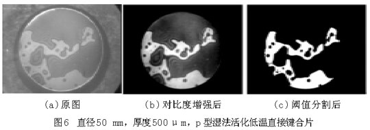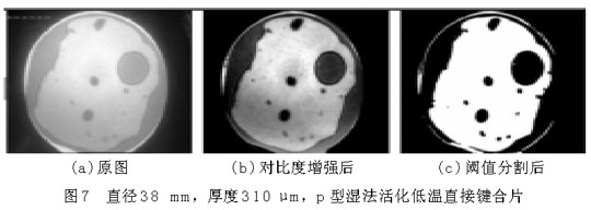 圖6(a)和圖7(a)中,圓形區(qū)域是要鍵合的圓片,其中明區(qū)為鍵合上的地方,暗區(qū)為未鍵合上的地方,圓形區(qū)域(即鍵合圓片)以外為圖像背景。從圖上可以大致地看出空洞(未鍵合區(qū)域)的分布、個數(shù)和大小等。為了獲得更為準(zhǔn)確的數(shù)據(jù)信息,借助圖像處理程序?qū)D片(a)進(jìn)行對比度增強(qiáng)、平滑、分割等一系列處理,可獲得圖(b),(c),從而得到鍵合率。樣品1的鍵合率為28.12%,鍵合率很低,并且從圖6中空洞的分布可以看出,樣品1鍵合得很不好。樣品2的鍵合率為66.12%。比較圖6和圖7,樣品2的鍵合質(zhì)量明顯優(yōu)于樣品1,可以說明鍵合圓片越薄,越容易鍵合??梢詮钠桨謇碚摾斫膺@一鍵合現(xiàn)象,圓片越薄,界面表面能克服圓片翹曲貼合到一起所需要的力越小。