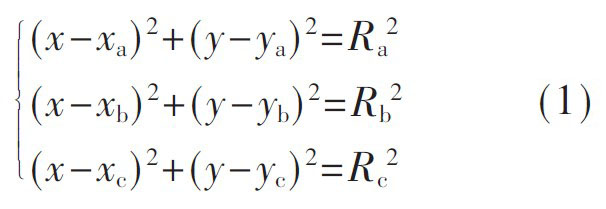 如圖3 所示, 在游戲場館C 區(qū)內(nèi), 設(shè)編號分別為a 、b 、c 的三個(gè)有源讀寫器的位置為(xa,ya) , (xb,yb) , (xc,yc) ,游客的位置坐標(biāo)(x,y), 三個(gè)讀卡器到游客的距離分別為Ra、Rb、Rc, 由時(shí)間信息定位方法(TOA) 可得式(1) , 即可求解游客的位置坐標(biāo)(x,y)。