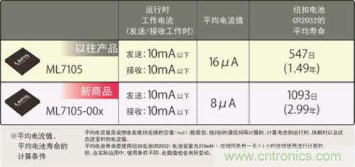 LAPIS Semiconductor去年推出的“ML7105”,實(shí)現(xiàn)了業(yè)界頂級(jí)的低耗電量(收發(fā)數(shù)據(jù)包時(shí)的運(yùn)行狀態(tài))。此次開(kāi)發(fā)出的新品“ML7105-00x”,不僅保持了運(yùn)行狀態(tài)下的低耗電量性能,而且平均電流還減少了一半。所謂平均電流,是指按一定間隔反復(fù)收發(fā)數(shù)據(jù)包時(shí)的運(yùn)行狀態(tài)(耗電量大)與休眠狀態(tài)(耗電量?。┑钠骄娏髦?。通過(guò)大幅減少改變狀態(tài)所需的時(shí)間,使平均電流減半,從而使電池壽命可達(dá)2倍。因此,按LAPIS Semiconductor的工況條件,支持Bluetooth® Low Energy的、使用紐扣電池(CR2032)的設(shè)備其電池壽命即使在24小時(shí)連續(xù)工作的條件下,也可充分使用2年。