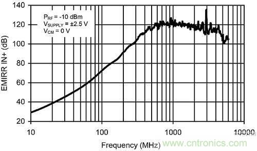 其中,EMIRR(dB) —— 從被傳導(dǎo)的RF信號處測定的電磁干擾抑制比(以dB為單位)被應(yīng)用到非反相放大器的輸入端