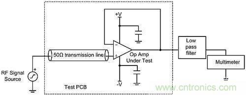 最后,用數(shù)字萬用表測量由RF信號產(chǎn)生的DC偏移電壓。請注意,在放大器和萬用表之間使用了低通濾波器,以防止由穿過放大器的殘余RF信號引起的潛在錯誤。圖2展示了用于表征EMIRR的測試電路。
