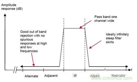 【導(dǎo)讀】中頻濾波器相對于RF信號,工作的頻率比較低。理想的中頻濾波器如文中所示,具有平坦的通帶特性及好群延遲特性,能夠無失真的通過希望的信號,同時具有很陡的過度帶,能夠提供足夠的鄰道抑制能力。
