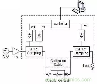 題外話:其實(shí)功率系數(shù)這個(gè)東東,不光是衰減器有,所有工作在大功率條件下的器件都有,只要工作功率的變化范圍比較大,就必須要考慮這個(gè)指標(biāo)。如何測(cè)試這個(gè)指標(biāo),一般需要一套標(biāo)準(zhǔn)的測(cè)試系統(tǒng),當(dāng)然也可以自己來搭建。下圖就是上篇提到的一個(gè)標(biāo)準(zhǔn)的測(cè)試功率系數(shù)的框圖,供大家參考: