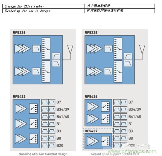 RF Flex 架構(gòu)還具有可擴展性,對于尋求全球擴展功能的制造商尤為寶貴;他們可以設(shè)計一款用于國內(nèi)的機型,并可迅速添加更多濾波器,從而支持其他國家/地區(qū)所使用的頻段。