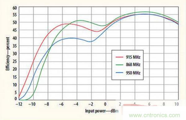 圖1顯示了Powercast P2110 Powerharvester接收器在多個(gè)頻段的性能,包括中心頻率為915MHz的工業(yè)-科學(xué)-醫(yī)療(ISM)頻段。