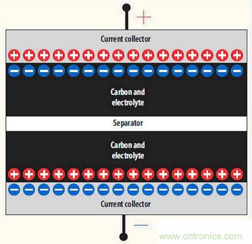 圖2是EDLC電容的橫截面圖。從圖中可以看到兩個(gè)由電解液包圍著的納米顆?;钚蕴紝樱娊庖褐虚g則有一個(gè)“隔離”層。這兩個(gè)碳層與集電極相接觸,并由集電極將電流輸送到外部。這兩個(gè)碳層由兩個(gè)串聯(lián)電容組成,因此命名為雙層電容或DLC。由于電容內(nèi)的電荷載體實(shí)際上處于離子態(tài),因此使用了術(shù)語(yǔ)電化學(xué)DLC(或EDLC)。這張圖也顯示了簡(jiǎn)單的原理,其中電荷主要集中在集電極-碳接口。電容(C)直接正比于有效面積(A),并反比于這些電荷(或C a A/d)之間的隔離距離(d)。雙層電容的正負(fù)電荷之間的間距在納米范圍,這正是EDLC電容容量如此大的原因(因?yàn)檫@個(gè)間距要比靜電電容的電荷間距小好幾個(gè)數(shù)量級(jí))。