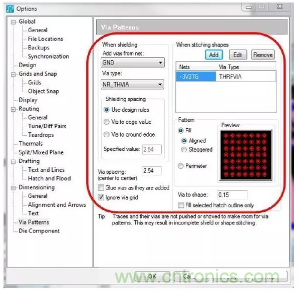 圖 5:利用支持射頻設(shè)計的PCB設(shè)計工具,您可以設(shè)定用于產(chǎn)生via模式的設(shè)計規(guī)則,并自動在您的設(shè)計中強制實施這些規(guī)則,從而節(jié)省您的時間和確保符合您的所有設(shè)計規(guī)則。
