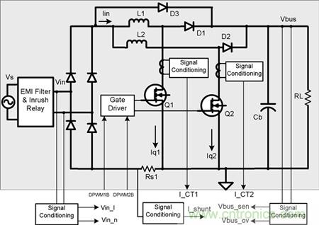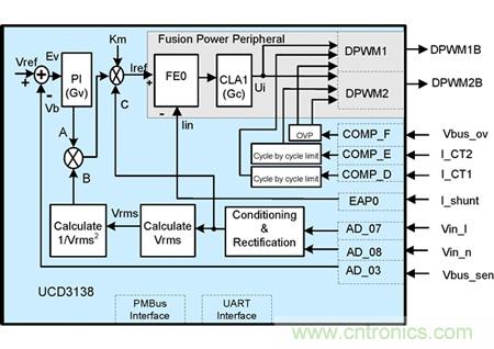 您可以看到固件外部仍有可使用示波器進(jìn)行監(jiān)控的模擬信號。另外,您是否注意到方框底部輸出的信號?這些信號將進(jìn)入 UCD3138 數(shù)字控制器并由固件處理,請看下圖。