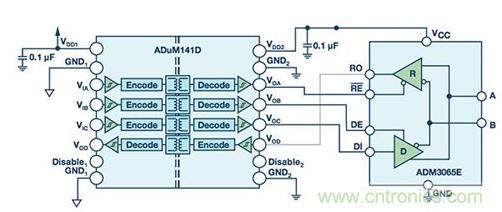 RS-485信號傳輸是平衡的差分式傳輸,本身便能抗干擾。系統(tǒng)噪聲均等地耦合到RS-485雙絞線電纜中的每條導(dǎo)線。一個信號的發(fā)射與另一個信號相反,耦合到RS-485總線的電磁場彼此抵消。這降低了系統(tǒng)的電磁干擾(EMI)。此外,ADM3065E增強(qiáng)的2.1 V驅(qū)動強(qiáng)度支持在通信中實現(xiàn)更高的信噪比(SNR)。給ADM3065E增加信號隔離可利用ADuM141D輕松實現(xiàn)。ADuM141D是一款采用ADI公司iCoupler®技術(shù)的四通道數(shù)字隔離器。ADuM141D的工作數(shù)據(jù)速率最高可達(dá)150 Mbps,因此它適合與50 Mbps ADM3065E RS-485收發(fā)器一起工作(參見圖2)。直接功率注入(DPI)法測量器件抑制注入到電源或輸入引腳的噪聲的能力。ADuM141D采用的隔離技術(shù)已通過測試,符合DPI IEC 62132-4標(biāo)準(zhǔn)。ADuM141D抗擾度性能超過同類產(chǎn)品。ADuM141D在整個頻率范圍內(nèi)保持了出色的性能,而其他隔離產(chǎn)品在200 MHz至700 MHz頻段出現(xiàn)位錯誤。