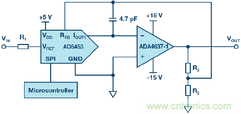 圖1顯示了一個帶下游放大器的14位MDAC AD5453 ,放大器可根據(jù)DAC的編程數(shù)字碼放大或削弱信號。