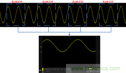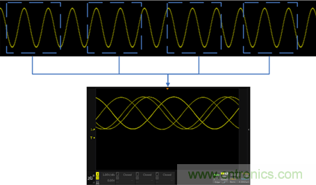 示波器的觸發(fā)條件的一個(gè)很關(guān)鍵的因素是觸發(fā)電平,觸發(fā)電平大多數(shù)情況下是用一根直流電平作為基準(zhǔn),當(dāng)信號(hào)的電壓超過(guò)該直流電平的時(shí)刻作為采樣波形的起始點(diǎn)。由于起始采樣的位置是有規(guī)律的,因此多次采樣的波形進(jìn)行疊加后看上去還是一個(gè)穩(wěn)定的波形。如圖3所示: