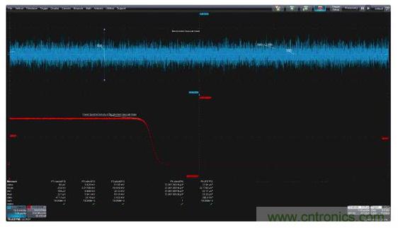 測(cè)量參數(shù)可以應(yīng)用于圖2中的噪聲波形,以深入了解這種噪聲信號(hào)的特性。圖中顯示的參數(shù)有平均值、標(biāo)準(zhǔn)偏差和峰峰值。顯示器下方顯示了讀取的參數(shù)值。