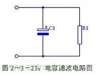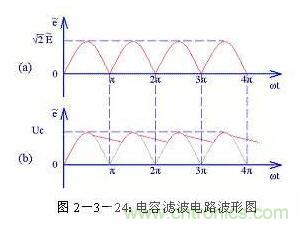 (1)電容濾波電路電容濾波電路圖見圖2-3-23,電容濾波電路是利用電容的充放電原理達(dá)到濾波的作用。在脈動(dòng)直流波形的上升段,電容C1充電,由于充電時(shí)間常數(shù)很小,所以充電速度很快;在脈動(dòng)直流波形的下降段,電容C1放電,由于放電時(shí)間常數(shù)很大,所以放電速度很慢。在C1還沒有完全放電時(shí)再次開始進(jìn)行充電。這樣通過電容C1的反復(fù)充放電實(shí)現(xiàn)了濾波作用。濾波電容C1兩端的電壓波形見圖2-3-24(b)。