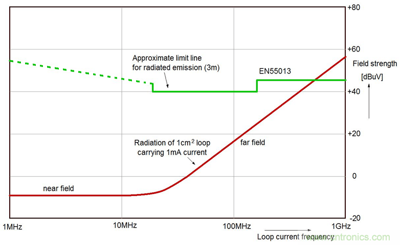 舉例而言,一個(gè)1cm²的電流環(huán),其中的電流為1mA,電流變化頻率為100MHz,則距離此電流環(huán)3m處的場(chǎng)強(qiáng)為4.4µV/m,或說(shuō)是12.9dBµV。