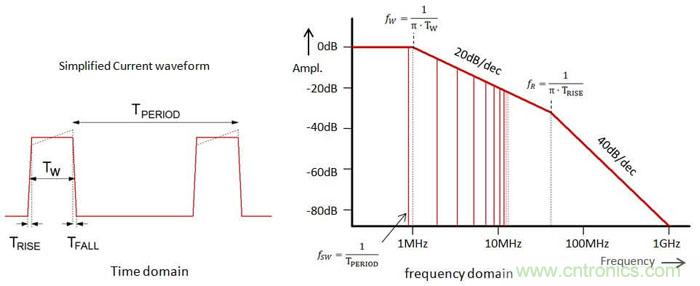 為了理解這能導(dǎo)致多大程度的改進(jìn),我們需要對(duì)不連續(xù)電流脈沖的高頻成分進(jìn)行一番探討。圖6左側(cè)顯示的是簡(jiǎn)化為梯形了的電流波形,其周期為T(mén)PERIOD,脈沖寬度為T(mén)W,脈沖上升/下降時(shí)間為T(mén)RISE。從頻域來(lái)看此信號(hào),其中含有基頻成分和很多高次諧波成分,通過(guò)傅里葉分析可以知道這些高頻成分的幅度和脈沖寬度、上升/下降時(shí)間之間的關(guān)系,這種關(guān)系被表現(xiàn)在圖6的右側(cè)。