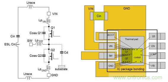 圖8顯示出了一個(gè)常規(guī)設(shè)計(jì)中的Buck轉(zhuǎn)換器IC中的寄生元件。