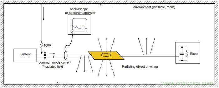 當(dāng)被測(cè)試對(duì)象被放在實(shí)驗(yàn)桌上時(shí),其PCB上的電流回路和導(dǎo)線就會(huì)向周?chē)h(huán)境輻射出高頻能量,這些輻射信號(hào)又會(huì)自己找到路徑返回到測(cè)試對(duì)象上,并以高頻共模電流的形式出現(xiàn)在供電線上。這些供電線上的高頻共模電流會(huì)和板上的電流結(jié)合在一起,可被用著輻射狀況的指示信號(hào)。