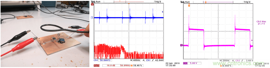 在此實(shí)驗(yàn)中,我們使用雙面PCB,輸入電容的放置位置如上面的實(shí)驗(yàn)2一樣,這樣的配置可以在輸入回路中引入比較明顯的輻射。