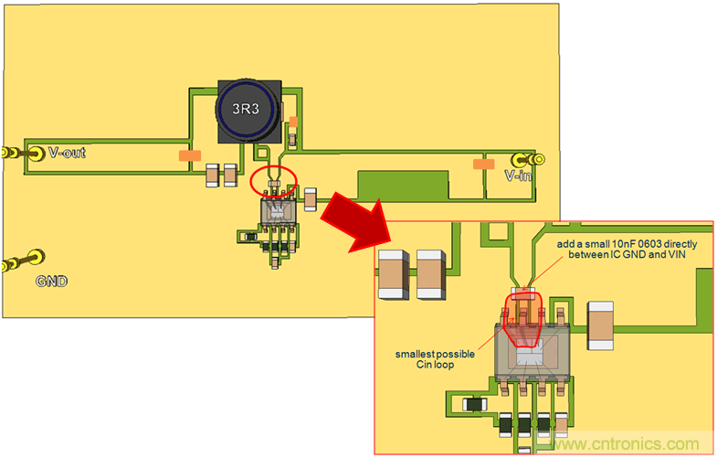 在上面的例子中,通到地線層的附加導(dǎo)通孔對(duì)縮減CIN回路的長(zhǎng)度沒(méi)有幫助。但在另一個(gè)例子中,由于頂層的路徑很長(zhǎng),通過(guò)導(dǎo)通孔來(lái)縮小回路面積就十分有效。