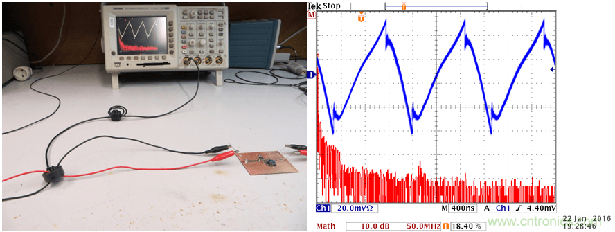 自制的EMI電流測(cè)試工具(見(jiàn)第8章)可被安置在電源輸入線和輸出線上。在本文中,我們是用示波器來(lái)觀看測(cè)量到的高頻電流信號(hào),它能顯示出轉(zhuǎn)換器開(kāi)關(guān)切換期間的高頻小信號(hào)。對(duì)于這種重復(fù)出現(xiàn)的開(kāi)關(guān)切換信號(hào)而言,使用示波器的FFT功能進(jìn)行計(jì)算并看到測(cè)量電流中的各種頻率成分是可能的。這種方法雖然不如頻譜分析儀那么精確,但仍然不失為一種非常實(shí)用的工具,可在簡(jiǎn)單電路的分析中提供判斷依據(jù)。