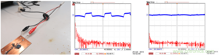 正如從圖29中看到的那樣,添加磁珠 + 電容構(gòu)成的濾波器可濾除除800kHz基波以外的所有高頻成分,添加1µH電感 + 電容構(gòu)成的濾波器可消除包含基波在內(nèi)的所有差模噪聲。