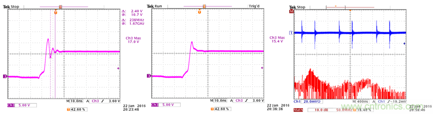 上述實(shí)驗(yàn)最重要的結(jié)論是確認(rèn)了更好地放置CIN可以改善開(kāi)關(guān)切換波形上的過(guò)沖和振鈴信號(hào)的幅度,還能降低高頻輻射。