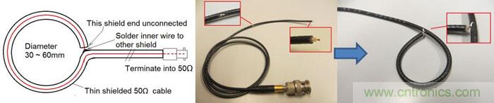 其實(shí)我們是有可能在實(shí)驗(yàn)室環(huán)境下對(duì)產(chǎn)品原型進(jìn)行一些基本的EMI測(cè)試的,還可對(duì)系統(tǒng)的各個(gè)模塊分別進(jìn)行。這樣的測(cè)試通常屬于近場(chǎng)環(huán)境(測(cè)量距離 < 0.16λ),因而在測(cè)試電流回路的輻射狀況時(shí)需要使用小型的環(huán)形天線來(lái)對(duì)高頻磁場(chǎng)進(jìn)行測(cè)量。你可以使用一段50Ω的同軸電纜自己制作小型的擁有電屏蔽的環(huán)形天線,這看起來(lái)并不是一件很難的事情,可參考圖43的示意進(jìn)行。