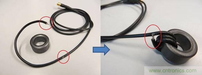 為了將測(cè)試工具和測(cè)試對(duì)象隔離開(kāi),最好是在電纜上加一個(gè)共模線圈,這可通過(guò)將引入分析裝置的電纜多次穿過(guò)一個(gè)扣合式的EMI鐵芯來(lái)實(shí)現(xiàn)。