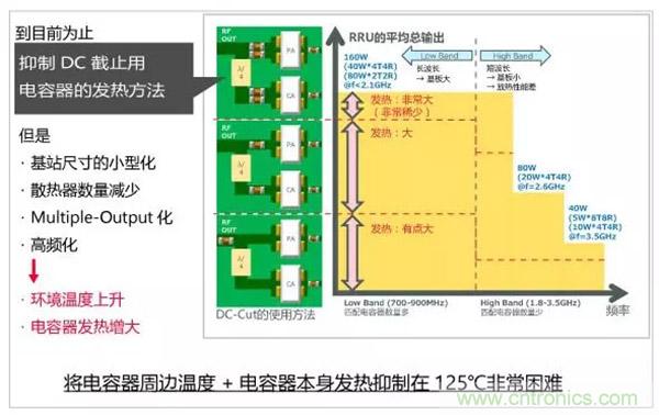 但是,近年來隨著Multiple-Output化(Tx增加)加速,一方面元件數(shù)量增加,而由于基站尺寸小型化,散熱器等散熱對策可用的空間越來越少。使用頻帶的進一度高頻化,元件發(fā)熱進一步增大,將電容器周邊溫度和自身發(fā)熱抑制在125℃,在電路設(shè)計上的制約案例中變得尤為顯著。