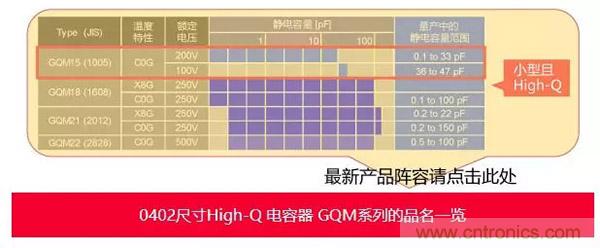 村田制作所的High-Q電容器除傳統(tǒng)的0603尺寸外,還新增0402尺寸到產(chǎn)品陣容。通過獨創(chuàng)的構(gòu)造、材料,即使靜電容量值很低,與標準規(guī)格產(chǎn)品(GRM系列)相比,也可實現(xiàn)高Q值。因兼具匹配用電容器的小型化和高Q值,有助于實現(xiàn)高頻PA電路設(shè)計的高密度化。
