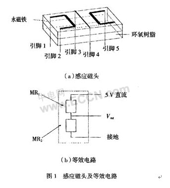 用銻化銦-銦共晶體薄膜磁阻元件制成MRCS的感應(yīng)磁頭(圖1)主要由導(dǎo)線、絕緣基片、InSb-In磁阻元件MR1和MR2、永磁體、5個(gè)引腳等組成,另外加上起屏蔽和保護(hù)作用的金屬外殼。MR1和MR2是相對(duì)放置的一對(duì)磁阻元件,其阻值大致相等,導(dǎo)線置于MR1和MR2的對(duì)稱軸位置。其等效電路如圖1(b)。