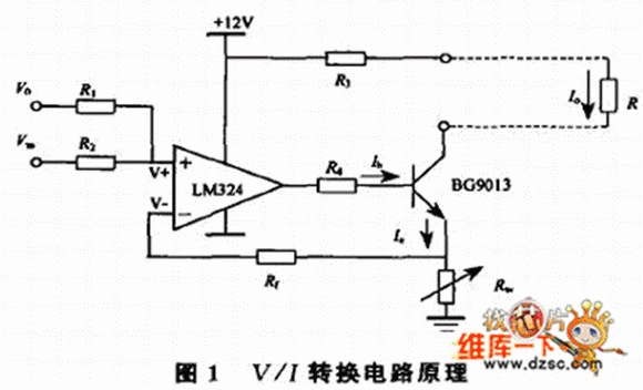 電壓/電流轉換即V/I轉換,是將輸入的電壓信號轉換成滿足一定關系的電流信號,轉換后的電流相當一個輸出可調(diào)的恒流源,其輸出電流應能夠保持穩(wěn)定而不會隨負載的變化而變化。V/I轉換原理如圖1。
