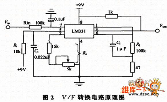 由Fout= Vin•Rs/(2.09•R1•Rt•Ct)可知,電阻Rs、R1、Rt和電容Ct直接影響轉換結果Fout,因此對元件的精度要有一定的要求,可根據(jù)轉換精度適當選擇,其中Rt、Ct、Rs、R1要選用低溫漂的穩(wěn)定元件,Cin可根據(jù)需要選擇0.1uF 或1uF 。電容C1對轉換結果雖然沒有直接的影響,但應選擇漏電流小的電容器。電阻R1和電容C1組成低通濾波器,可減少輸入電壓中的干擾脈沖,有利于提高轉換精度。電路中的47Ω 電阻對確保電路線性失真度小于0.03% 是十分必須的。