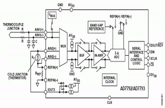 圖1給出利用3通道、16/24位AD7792/AD7793Σ-Δ模數(shù)轉(zhuǎn)換器(也可以使用6通道AD7794/AD7795)的熱電偶系統(tǒng)。其片內(nèi)儀表放大器首先對熱電偶電壓進(jìn)行放大,然后通過模數(shù)轉(zhuǎn)換器對放大的電壓信號進(jìn)行模數(shù)轉(zhuǎn)換。熱電偶產(chǎn)生的電壓偏置在地電平附近。片內(nèi)激勵電壓源將其偏置到放大器線性范圍以內(nèi),因此系統(tǒng)能夠利用單電源工作。這種低噪聲、低漂移、片內(nèi)、帶隙基準(zhǔn)電壓源,能夠確保模數(shù)轉(zhuǎn)換的精度,從而保證整個溫度測量系統(tǒng)的精度。